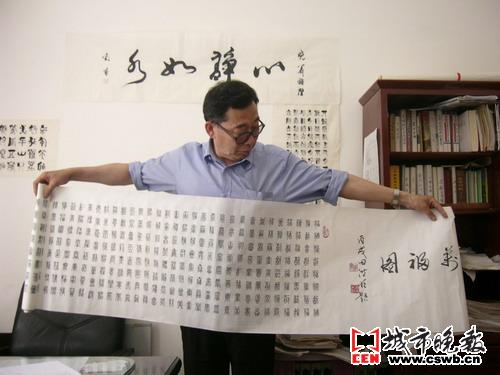 “万福图”献给北京奥运赵羽/摄 主角:付晓义 关键词:福字献奥运 都市心愿 ■记者 赵羽/报道 本报吉林市电 从蛟河市法院退休的付晓义自幼研习书法。并通过自己研究总结,将字体变形,写出了2008个字体不同的福字。他表示,希望将这2008个福字献给奥运组委会,祝奥运会圆满成功。 今年59岁的付晓义对中国传统的书法、绘画有一种特别的偏爱。退休后,开始潜心研究书法艺术。1992年,他无意中看到了一幅百福图,他想起福文化在中国人心中的地位。决定收集各种字体的福字。从此,报纸、杂志,甚至在饭店喜庆婚宴上看到的福字,他都描摹下来,回家后再临摹到宣纸上。对这些福字倾注了他所有的情感,付晓义感慨地说,中国福字文化太渊源流长了,他收集了15年,仍然没有找全。 今年4月份的时候,付晓义将自己收集的福字进行整理,终于在24米长的宣纸上完成了2008个福字的“万福图”。他表示,要将这个“万福图”献给奥运组委会,预祝奥运会圆满成功。